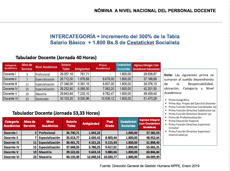 De esta manera, los docentes con jornadas de 40 horas tendrán salarios entre Bs.S 28.638,67 y 51.470,28 (de Docente I a Docente VI).