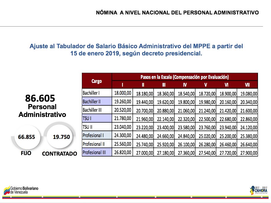 Respecto al personal administrativo, de Bachiller a Profesional III, en sus pasos uno al siete, los salarios se fijan entre Bs.S 18.000 y 27.900; con el mismo esquema, entre Obrero No Calificado Grado I y Obrero Supevisor Grado X el salario se establece entre Bs.S 18.000 y 23.130.