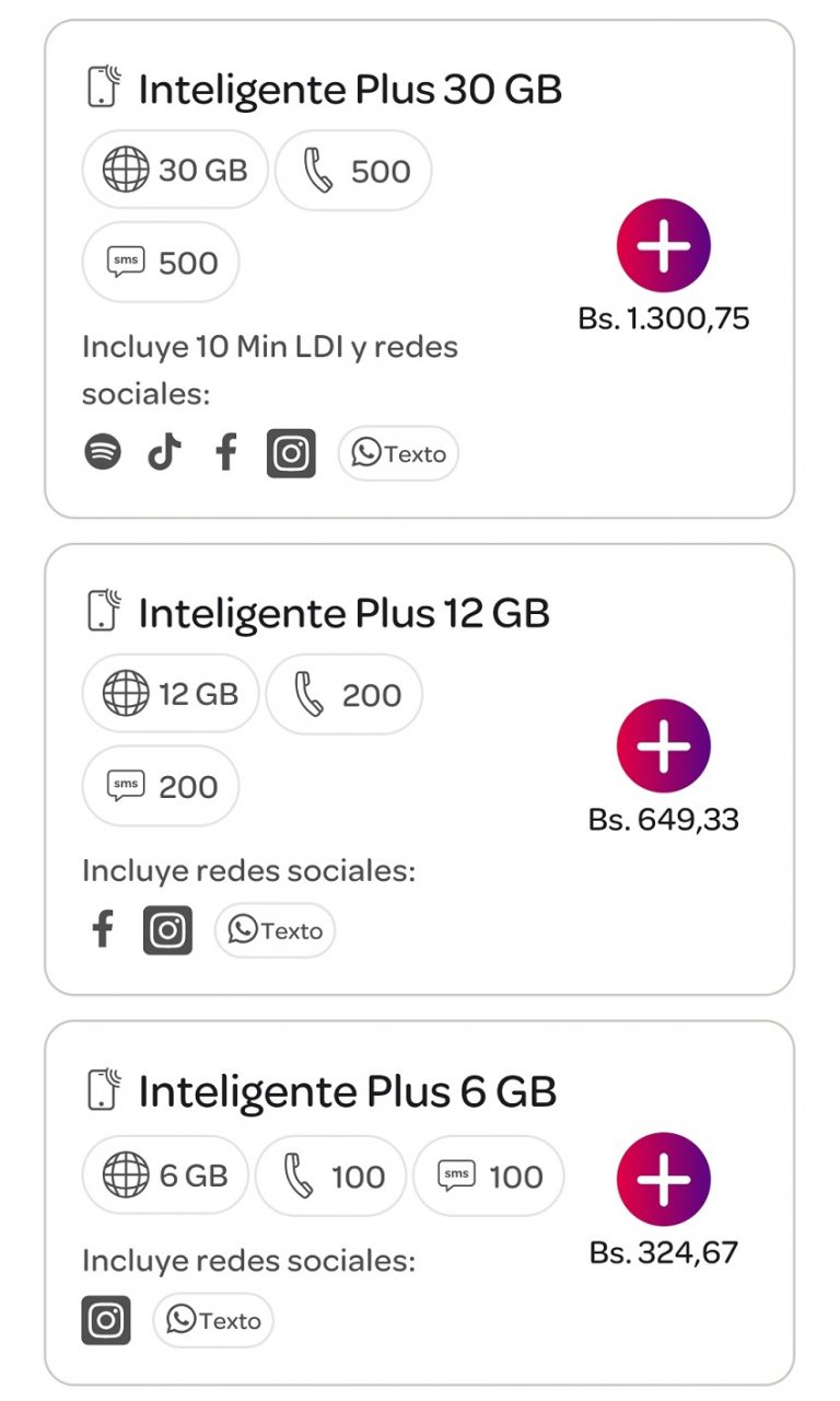 – Plan Inteligente Plus 30 GB: Bs. 1.300,75.