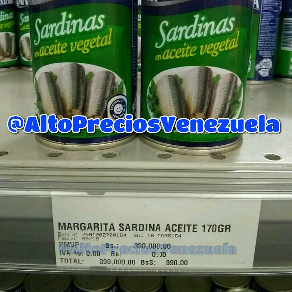 La sardina en lata ya no es una alternativa para los venezolanos. Una lata de sardina en aceite de la marca Margarita de 170 gramos cuesta esta semana Bs. 390 mil, es decir, 390 bolívares soberanos.