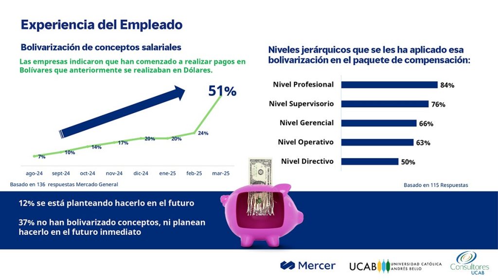 “Los esquemas de pago en moneda extranjera están desapareciendo de la compensación de los trabajadores. Principalmente es el bolívar lo que está presente y la tasa que se usa es la del BCV. ¿Esto a que se debe? A que más del 70% de lo que las empresas facturan lo están recibiendo en bolívares».
