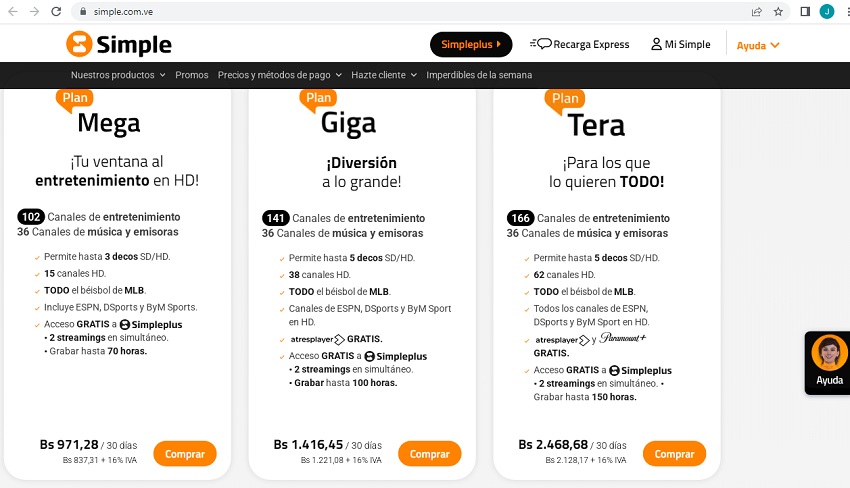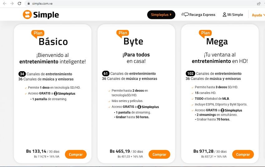 Igualmente, el Plan Byte tiene un costo de Bs. 465,19, manteniendo el mismo valor del mes de marzo. Cuenta con 97 canales de programación variada, así como también tiene la posibilidad de agregar 2 decodificadores y tiene acceso gratis a Simpleplus.