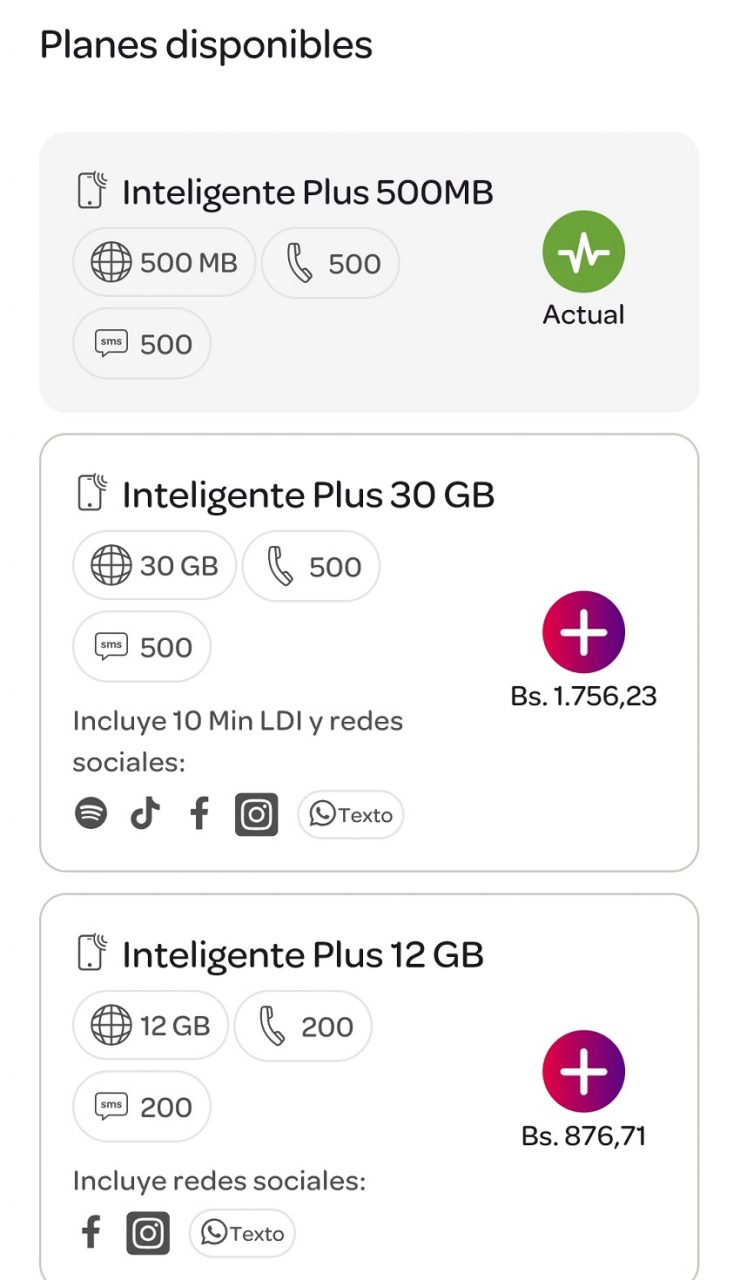 – Plan Inteligente Plus 30 GB: Bs. 1.756,23.
