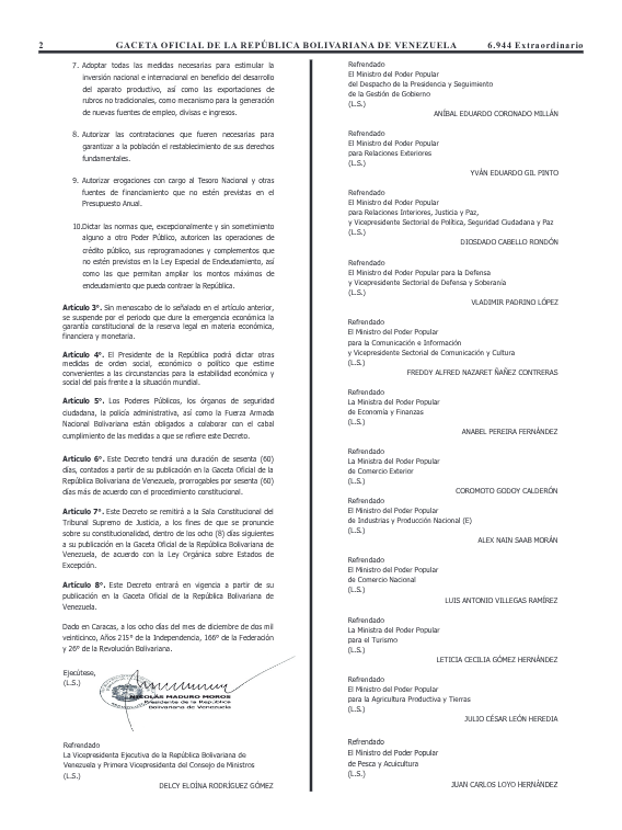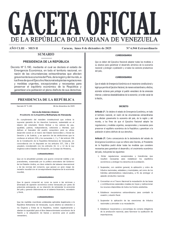 El Gobierno Nacional prorrogó por 60 días la declaratoria del estado de emergencia económica que rige en el país desde abril de este año. La norma fue publicada en la Gaceta Oficial Extraordinaria N° 6.944, fechada el pasado 8 de diciembre.