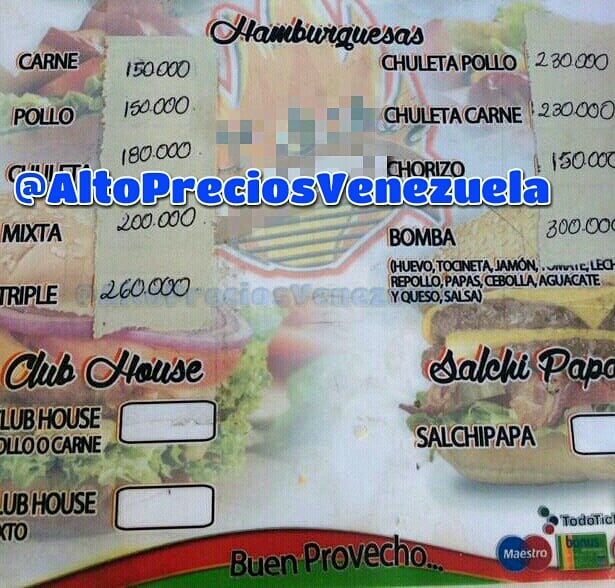 Estos alimentos, también conocidos como “balas frías”, se pueden conseguir en varios sitios de Caracas entre 100 y 500 bolívares si son perros normales, de carne, pollo, mixto o pepito de 60 centímetros; mientras que las hamburguesas, rondan los 300 bolívares (hamburguesa bomba).