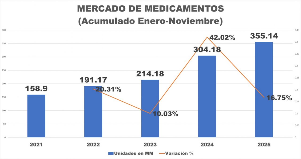 En términos de volumen, este formato aportó 81,1 millones de unidades, representando el 22,8% del total de medicamentos distribuidos en el mercado farmacéutico nacional durante el período enero-noviembre.