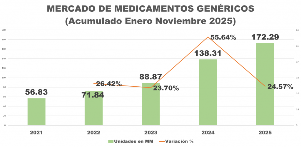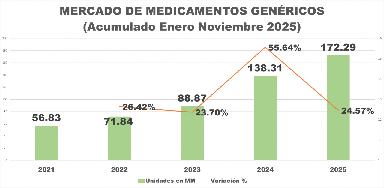 Entre enero y noviembre, el segmento de medicamentos genéricos registró un volumen de 172,2 millones de unidades comercializadas. El acumulado de los 11 meses del año muestra una variación en este segmento del 24,57% respecto al período anterior.