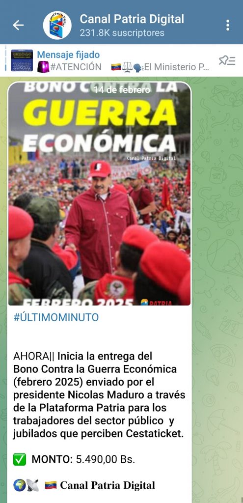 Este 14 de febrero de 2025, inició la entrega del bono «Contra la Guerra Económica», correspondiente al mes en cursos, a través de la Plataforma Patria.