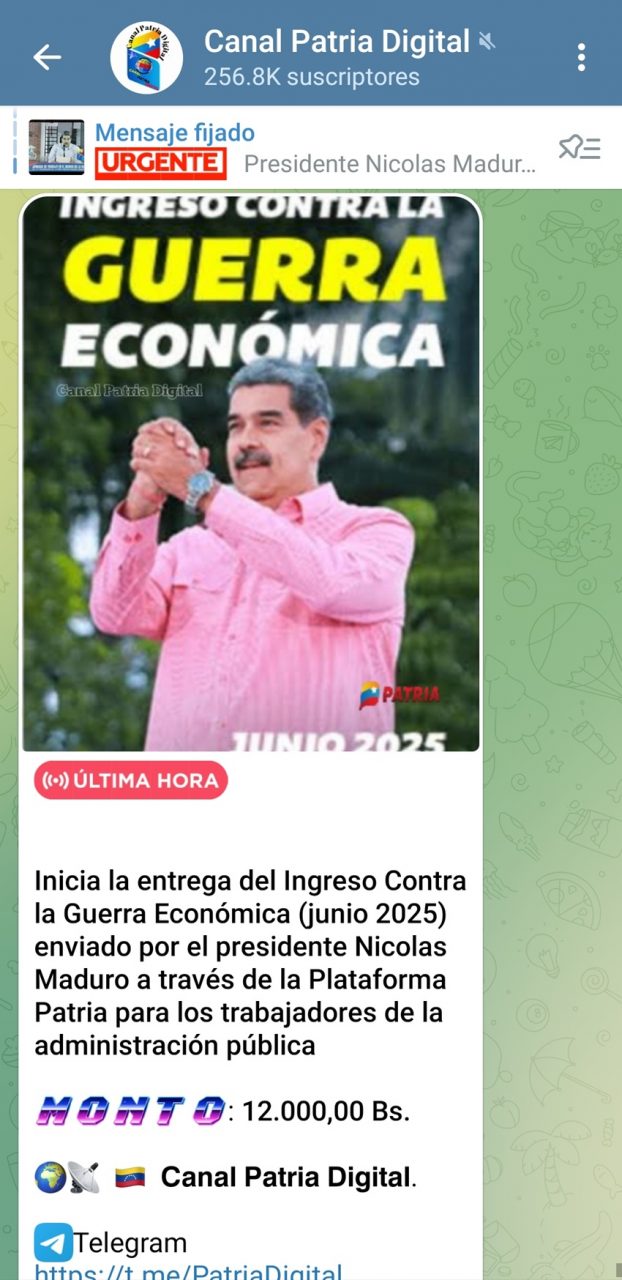 «Monedero Patria: Crédito por Bs. 12.000 por concepto de bono Contra la Guerra Económica (junio de 2025)», puntualizó el mensaje que reciben los beneficiarios.