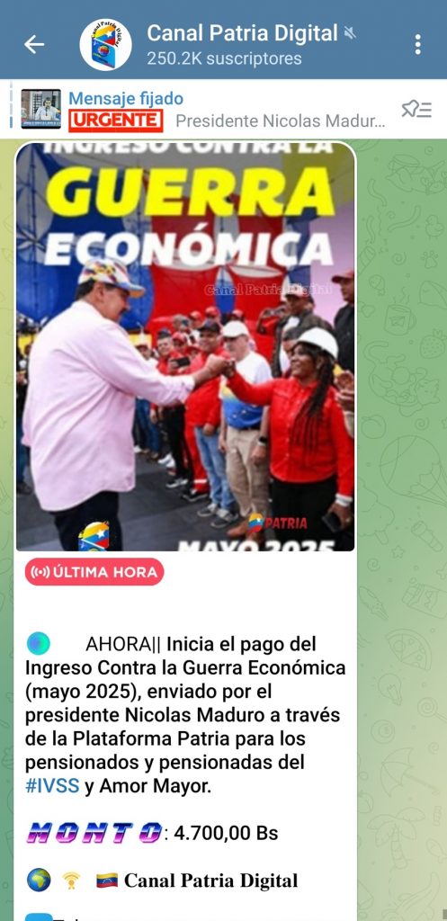 Este miércoles 21 de mayo de 2025, comenzó el pago del bono «Contra la Guerra Económica», correspondiente al mes en curso, a través del Carnet de la Patria.