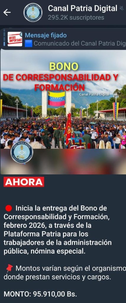 Este viernes 27de febrero 2026, el Ejecutivo nacional anunció el pago del bono de «Corresponsabilidad y Formación», correspondiente al mes en curso, a través de la Plataforma Patria.
