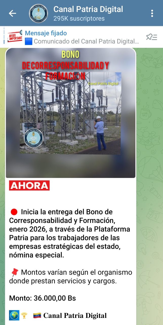 El Canal Patria Digital puntualizó en sus redes sociales que el monto otorgado es de Bs. 36.000 o US$ 106,99 al tipo de cambio vigente del Banco Central de Venezuela (BCV).