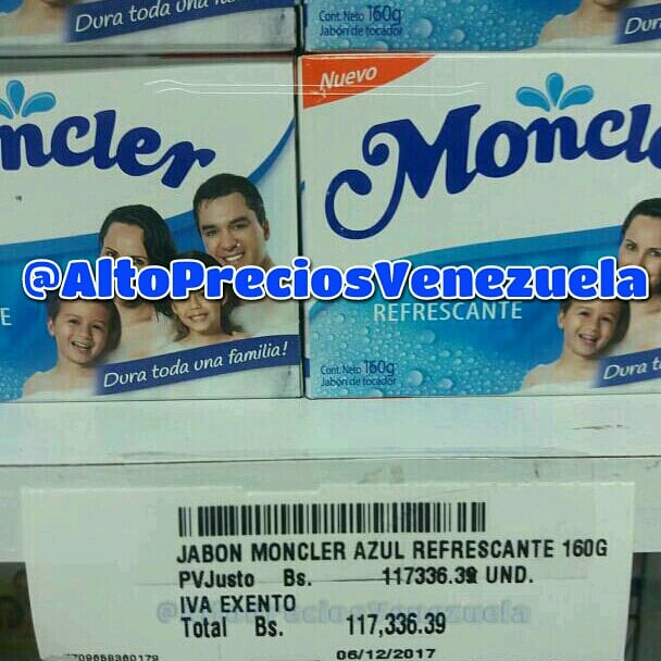 La cuenta Twitter @AltosPreciosVzla, denunció que el jabón de marca Moncler en su presentación de 160 gramos está siendo vendido en 117 mil 336 bolívares, costo que, además de exorbitante, se ha convertido en impagable para el pueblo trabajador, publicó LaIguana.TV