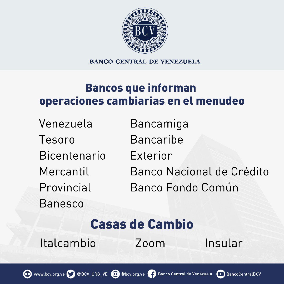 El Banco Central de Venezuela (BCV) publicó el pasado martes 14 de mayo a través de su cuenta Twitter, la lista de entidades financieras, tanto públicas como privadas, y de casas de cambio autorizados para efectuar la compra-venta de divisas.