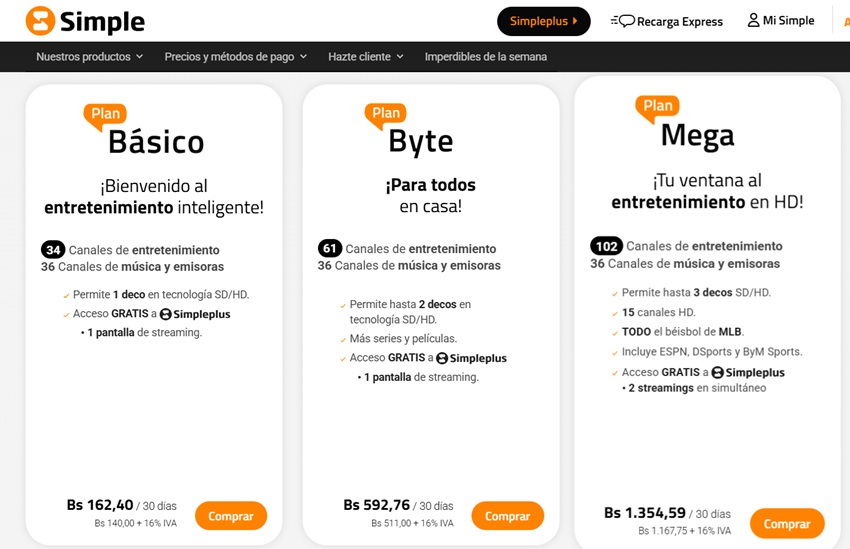 El Plan Básico cuesta Bs. 162,40, lo que significa un incremento de un 11,11% en bolívares. Además, tiene 70 canales, solo permite un decodificador y tiene acceso gratis a Simpleplus.