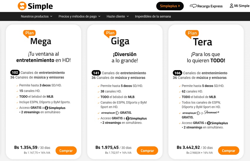 Igualmente, el Plan Giga HD tiene un precio de Bs. 1.975,45, registrando un incremento del 11,12% en bolívares si se compara con el mes anterior. Tiene 177 canales, permite hasta 5 decodificadores adicionales, tiene 38 canales HD y tiene acceso gratis a Simpleplus.