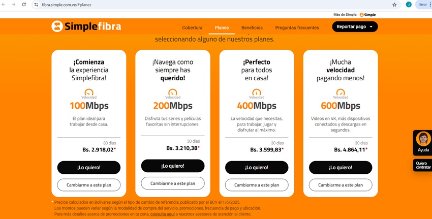 El Plan Mega HD tiene un costo para este mes de Bs. 1.354,59, lo que significa un aumento del 11,12% en bolívares en comparación al mes de mayo de 2025, según refleja la página web de la compañía.