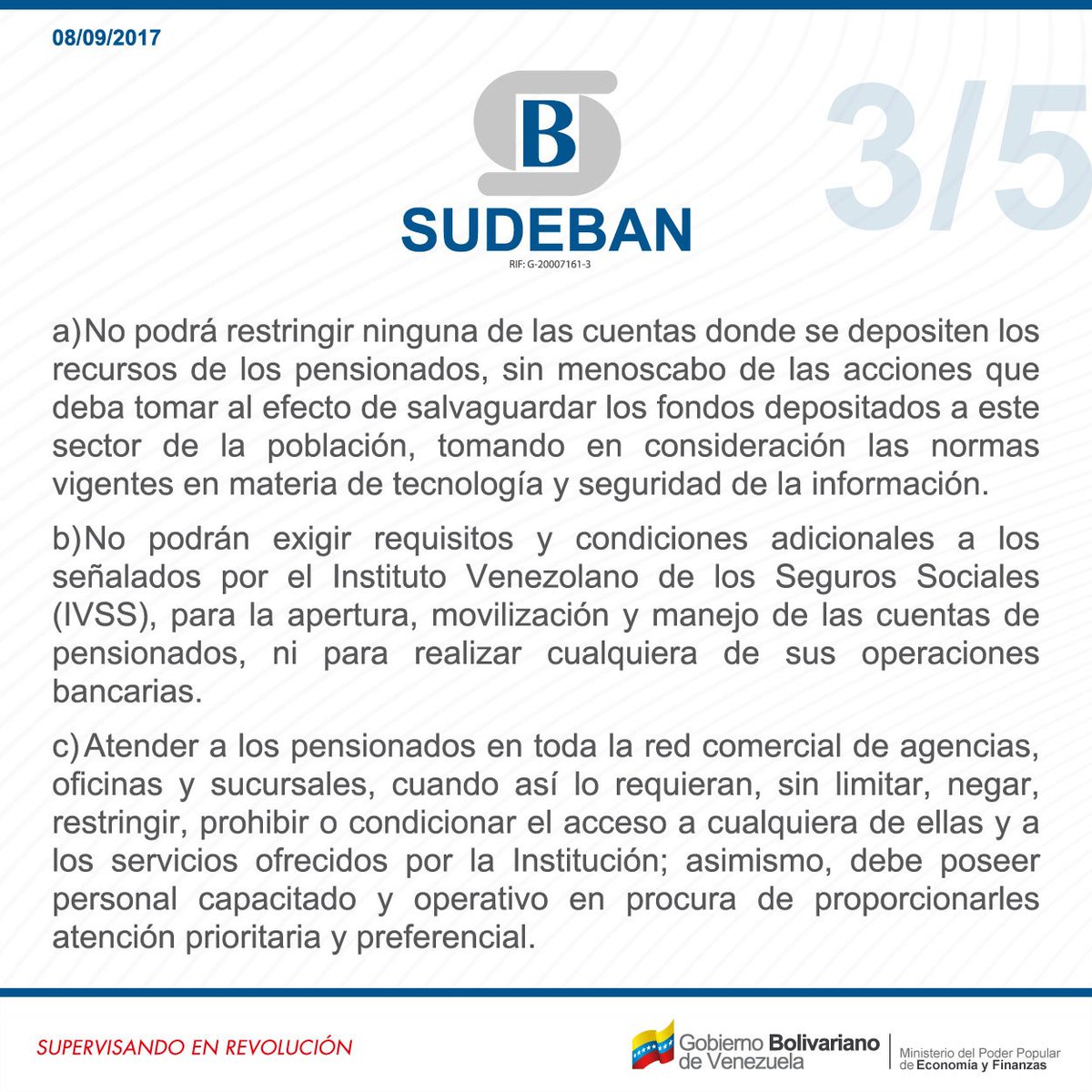 -No podrán exigir requisitos y condiciones adicionales a los señalados por el Instituto Venezolano de los Seguros Sociales (Ivss) para la apertura, manejo, de las cuentas de pensionados ni para realizar cualquiera de sus operaciones bancarias.