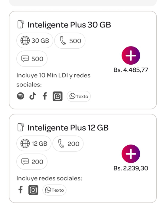 – Plan Inteligente Plus 30 GB: Bs. 4.485,77.