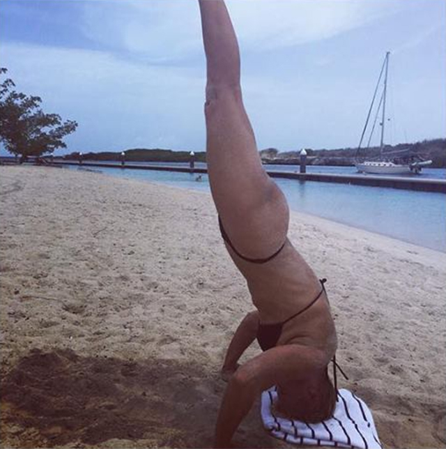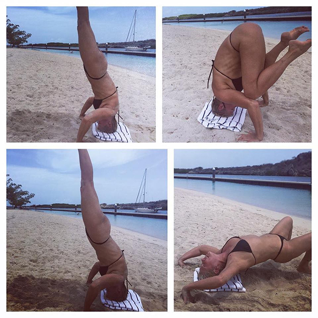 «Ay, les juro que intento», escribió en Instagram, y adjuntó un collage de cuatro imágenes donde realiza la típica postura «invertida», una de las maneras de practicar la disciplina.