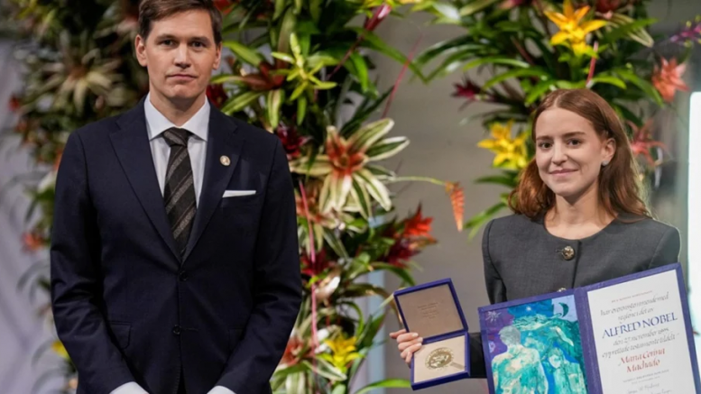Ana Corina Sosa, hija de la opositora venezolana María Corina Machado, recibió este miércoles el Premio Nobel de la Paz en representación de su madre, quien no pudo asistir a la ceremonia por «inconvenientes logísticos».