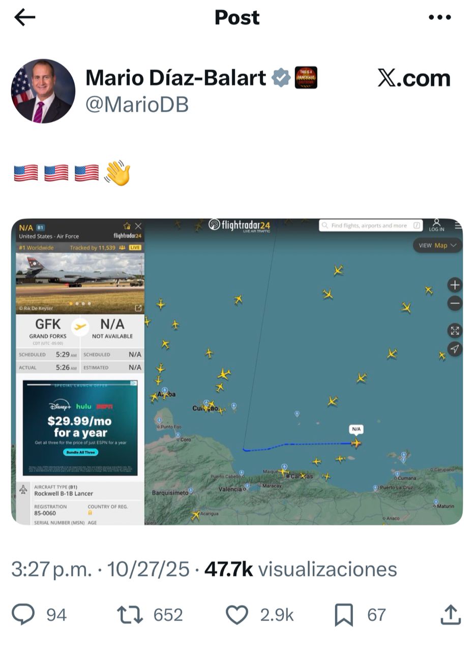El miembro de la Cámara de Representantes de Estados Unidos, Mario Díaz-Baralt, compartió en su cuenta de X la imagen del recorrido que hicieron los bombarderos la tarde de este lunes, acompañado de unas banderas del país norteamericano, en símbolo de celebración.