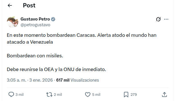 «En este momento bombardean Caracas. Alerta a todo el mundo: han atacado a Venezuela«, expresó el mandatario colombiano en su cuenta de X, quien instó a la Organización de Naciones Unidas (ONU) y a la Organización de Estados Americanos (OE) a una reunión urgente.