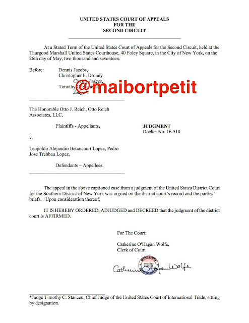 De acuerdo a la decisión el 26 de mayo de 2017 por el panel de jueces conformado por: Dennis Jacobs, Christopher F. Droney y Timothy C. Stanceu la petición del embajador Otto Reich no procede y por tanto se reafirma lo decretado por el juez de la Corte del Distrito Sur de Nueva York según el cual la demanda no procede porque el tribunal de Nueva York carece de jurisdicción para atender el caso.