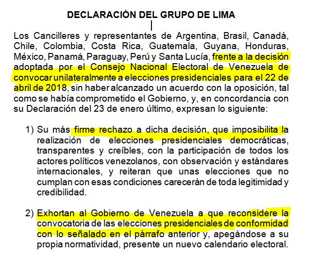 El Grupo de Lima emitió una declaración después de la reunión que sostuvo este martes en Perú, donde exhortó al gobierno venezolano a reconsiderar la convocatoria de elecciones presidenciales fijadas por el Conseja Nacional Electoral (CNE) para el próximo 22 de abril.