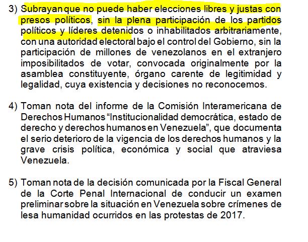 También sostuvo que “las elecciones que ha llamado unilateralmente el gobierno de Maduro no cumplen con ningunas de las condiciones democráticas, libres transparentes ni con las garantías que todo el mundo conoce como una elección democrática”, por lo que desestimó la validez de ese proceso.