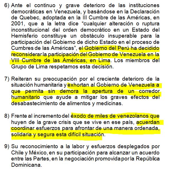Por otra parte, el gobierno peruano decidió “reconsiderar la participación del Gobierno de Venezuela en la VIII Cumbre de las Américas” que se realizará en Lima, alegando el “continuo y grave deterioro de las instituciones democráticas en Venezuela”.