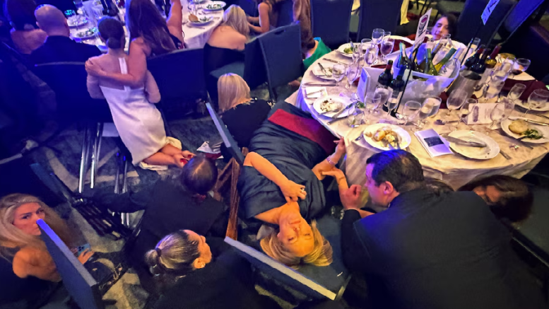Mientras la mayoría de los asistentes buscaba resguardo bajo las mesas, Michael Glantz, un representante de la industria artística, se mantuvo sentado observando los sucesos y degustando una ensalada