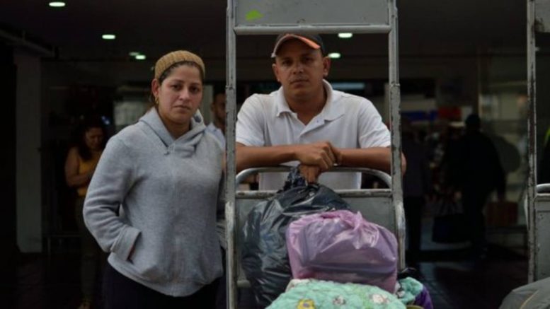Es domingo en la estación central de buses de Bogotá. Gustavo y Arlyn, visiblemente cansados, empujan unos carros apenas cargados. Llevan menos bultos que los que algunas familias necesitan para irse de vacaciones.