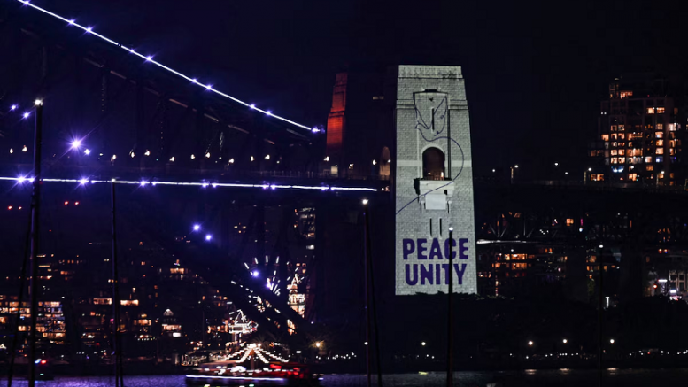Un mensaje que dice «Paz, Unidad» se muestra en el pilono del Puente del Puerto de Sídney para reflexionar sobre el trágico ataque a tiros en Bondi Beach antes del espectáculo de fuegos artificiales de medianoche de Nochevieja en Sídney el 31 de diciembre de 2025.