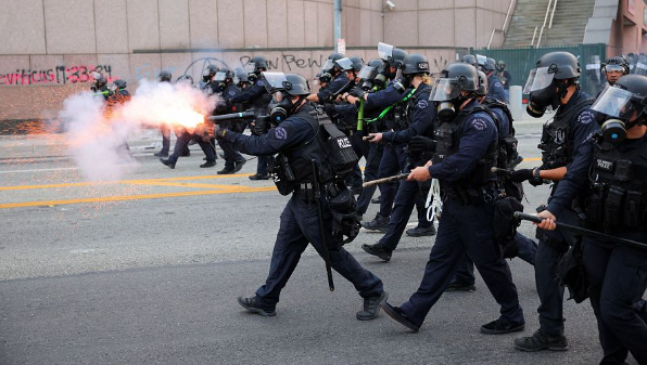 Un vídeo grabado en directo por Reuters muestra a agentes del Departamento de Policía de Los Ángeles alineados en una calle del centro de la ciudad blandiendo porras y lo que parecen ser rifles de gas lacrimógeno, enfrentándose a manifestantes después de que las autoridades hubieran ordenado a la multitud de manifestantes que se dispersara al caer la noche. Al principio del enfrentamiento, algunos manifestantes lanzaron trozos de hormigón roto contra los agentes, y la policía respondió disparando salvas de gas lacrimógeno y gas pimienta.