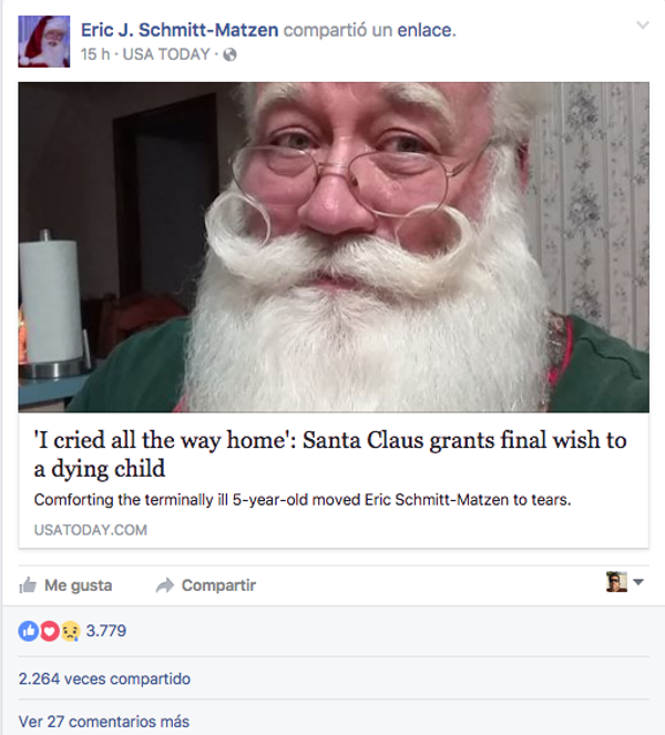«Me hizo dar cuenta del papel que tengo que desempeñar», manifestó el Santa Claus de medio tiempo, cuya página de Facebook ha sido inundada de ‘me gusta’. «Para ellos y para mí», concluyó.