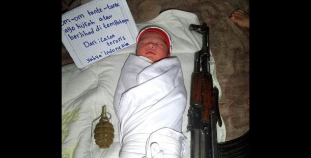 La imagen de un recién nacido acostado al lado de una granada y una AK 47 está siendo utilizada por miembros de la organización en Indonesia, para reclutar a losterroristas del mañana