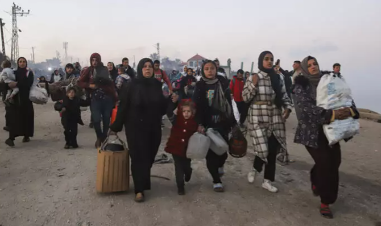 Hombres, mujeres y niños de todas las edades caminan al mismo paso, algunos con sus pertenencias al hombro, otros empujando carros improvisados con lo que han podido salvar tras meses de desplazamientos y miedo a morir en los bombardeos.