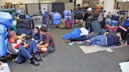 Una fortaleza de maletas envueltas en plástico azul se ha construido frente al mostrador de la aerolínea Santa Bárbara en el aeropuerto internacional de Miami,…