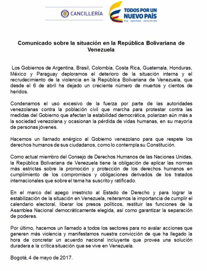 “Condenamos el uso excesivo de la fuerza por parte de las autoridades venezolanas contra la población civil que marcha para protestar contra las medidas del Gobierno que afectan la estabilidad democrática, polarizan aún más a la sociedad venezolana y ocasionan la pérdida de vidas humanas, en su mayoría de personas jóvenes”, señaló el comunicado dado a conocer por la Cancillería colombiana.