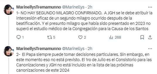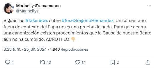 «Siguen las fake news sobre José Gregorio Hernández. Un comentario fuera de contexto del papa no es una prueba de nada. Para que ocurra una canonización existen procedimientos que la causa de nuestro beato aún no ha cumplido», indicó en su cuenta en Twitter (X).