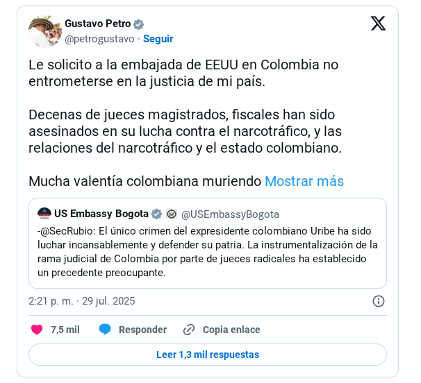 «Le solicito a la embajada de EE.UU. en Colombia no entrometerse en la justicia de mi país», expresó Petro a través de X, donde respondió a un mensaje emitido por la sede diplomática estadounidense en Bogotá donde citan palabras del secretario de Estado norteamericano, Marco Rubio, tras el fallo emitido contra el expresidente colombiano, Álvaro Uribe.