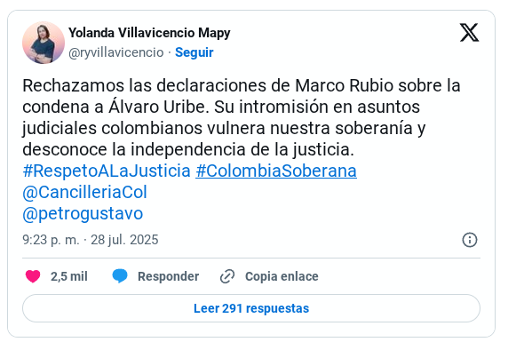 Previamente, la canciller encargada de Colombia, Rosa Villavicencio, expresó el rechazo de Bogotá ante la «intromisión» de Rubio. «Rechazamos las declaraciones de Marco Rubio sobre la condena a Álvaro Uribe. Su intromisión en asuntos judiciales colombianos vulnera nuestra soberanía y desconoce la independencia de la justicia», dijo la diplomática.