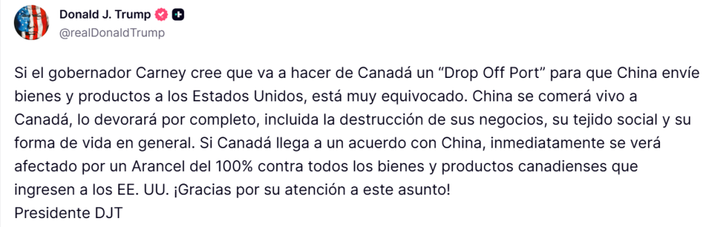 «China se tragará a Canadá, la devorará por completo, incluyendo la destrucción de sus empresas, su tejido social y su estilo de vida en general. Si Canadá firma un acuerdo con China, se le impondrá inmediatamente un arancel del 100% a todos los bienes y productos canadienses que entren a Estados Unidos», añadió en su mensaje.