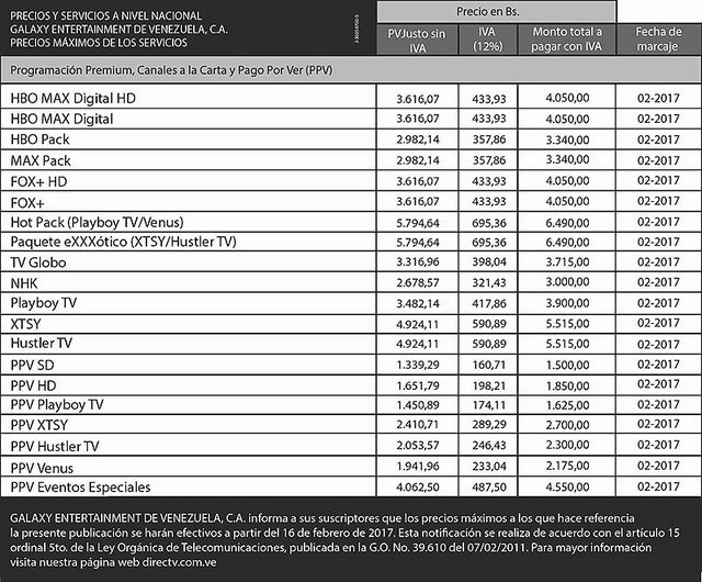 Los montos varían desde Bs. 4.050 para paquetes como Fox+, Fox+ HD, HBO MAX Digital y HBO MAX Digital HD, hasta Bs. 6.490 para los paquetes de contenido adulto. Asimismo, el Pay Per View para eventos especiales se situó en 4.550 bolívares.