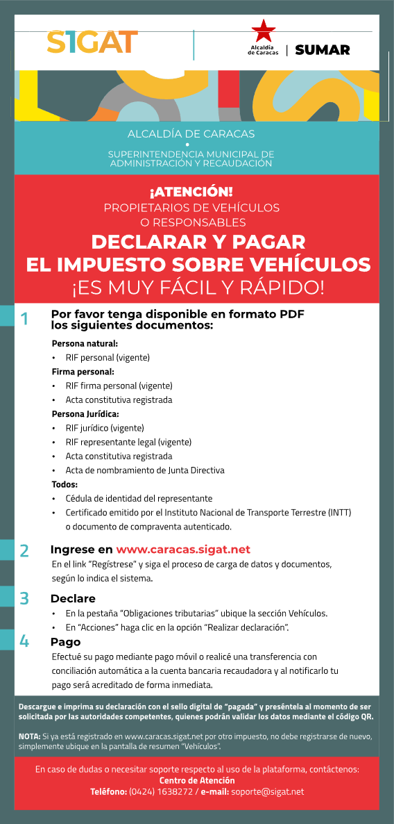 La Superintendencia Municipal de Administración y Recaudación (Sumar), ente adscrito a la Alcaldía de Caracas, informó que las personas propietarias de vehículos particulares o de uso comercial y rutas de transporte público que estén residenciados o domiciliados en la localidad, deberán pagar el Impuesto sobre Vehículos.