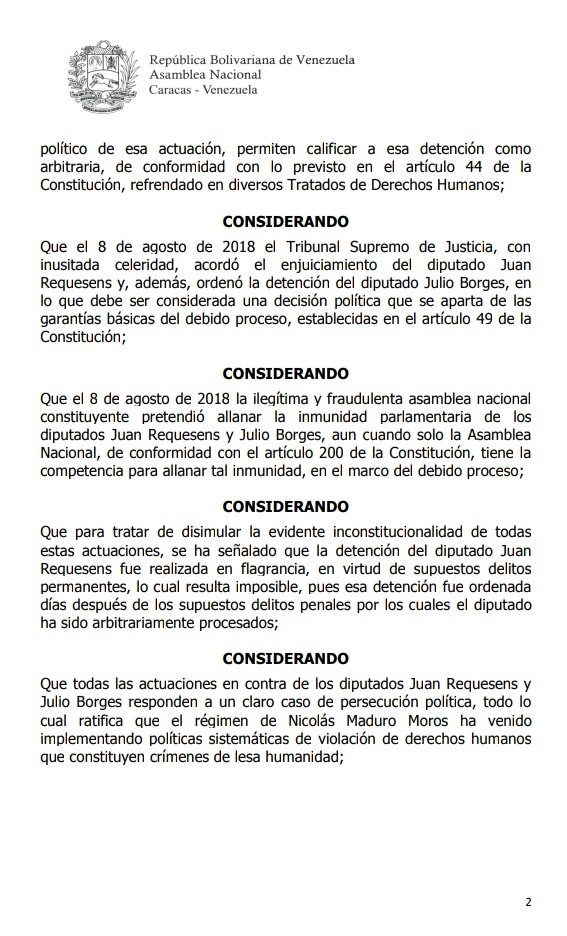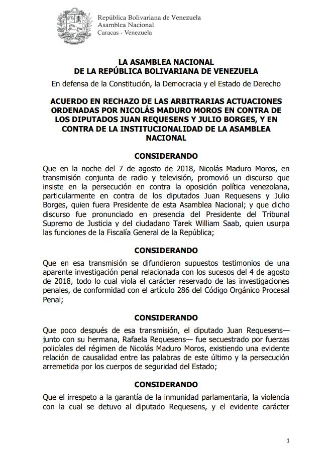 La #AsambleaVe aprobó un Acuerdo en Rechazo a las Arbitrarias Actuaciones Ordenadas por Nicolás Maduro en contra de los diputados @JuanRequesens y @JulioBorges y en contra de la Institucionalidad de la Asambla Nacional. #9Ago #SesiónAN pic.twitter.com/UIYtqB3sb9
