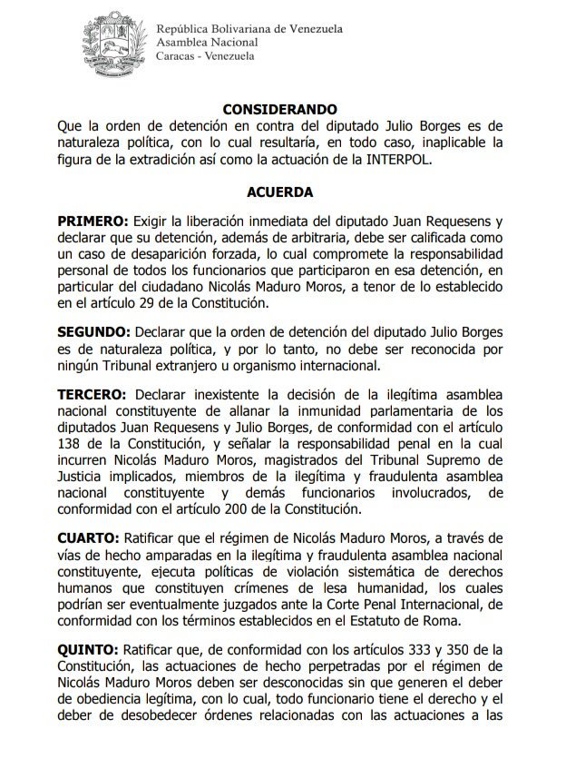 El documento lleva por nombre Acuerdo en Rechazo a las Arbitrarias Actuaciones Ordenadas por Nicolás Maduro Moros en contra de los diputados Juan Requsens y Julio Borges, y en contra de la institucionalidad de la Asamblea Nacional.