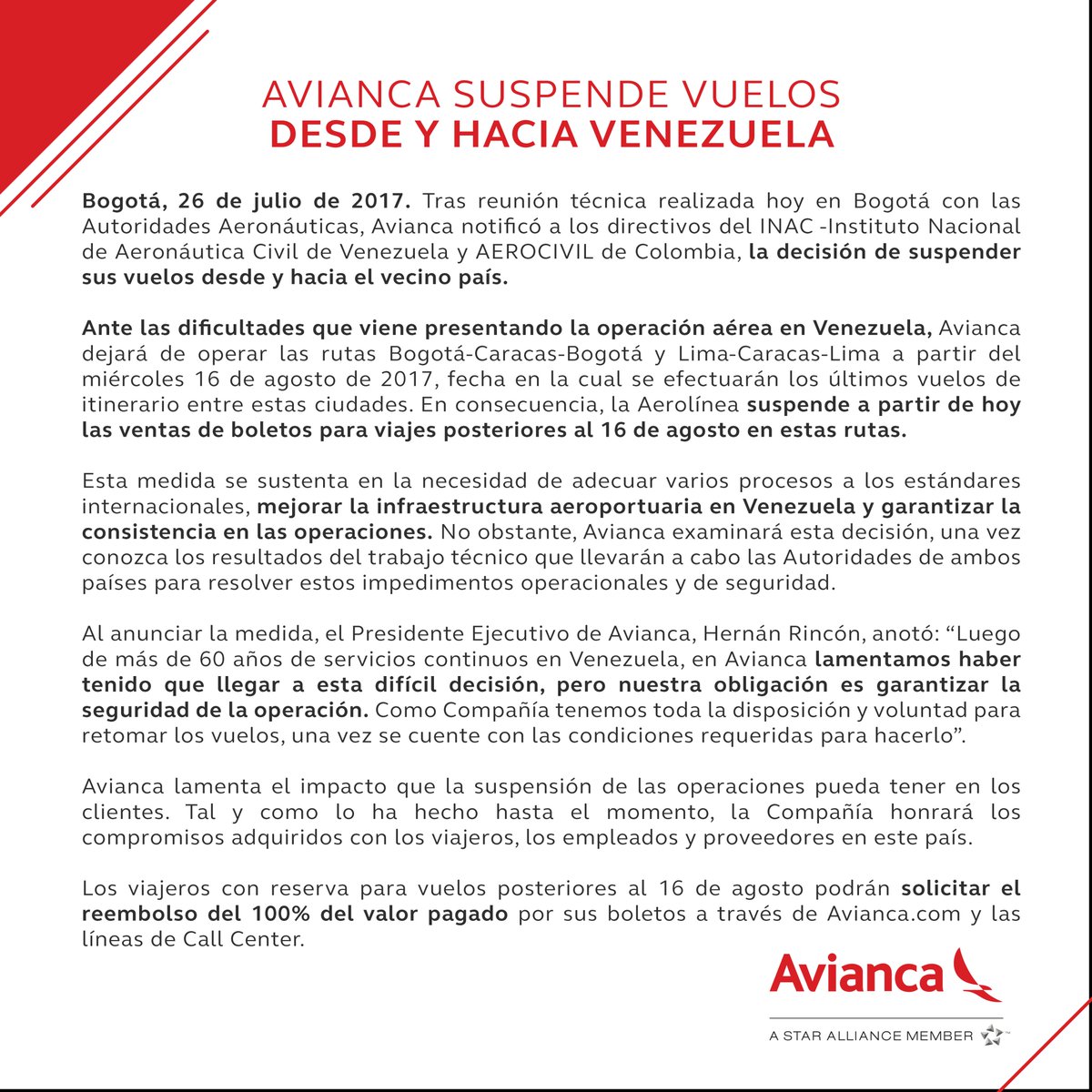 “Luego de más de 60 años contínuos en Venezuela, en Avianca lamentamos haber tenido que llegar a esta difícil decisión, pero nuestra obligación es garantizar la seguridad de nuestra operación”, aseguró su presidente ejecutivo, Hernán Rincón, al tiempo que no descarta retomar los vuelos “una vez se cuente con las condiciones para hacerlo”.