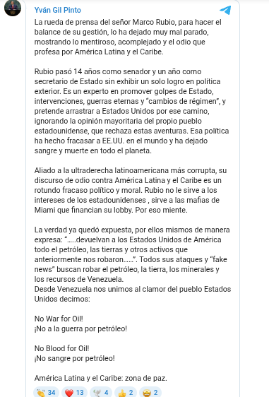«La rueda de prensa del señor Marco Rubio, para hacer el balance de su gestión, lo ha dejado muy mal parado, mostrando lo mentiroso, acomplejado y el odio que profesa por América Latina y el Caribe», escribió Gil mediante sus redes sociales.